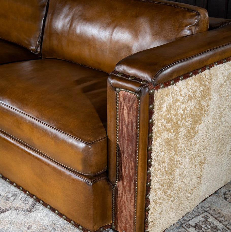 The plush pillow back provides a sofa, sink in comfort that is great for relaxing. Premium Shearling hides wrap around the sides and back, accented with a thick leather belting. Black walnut is hand cut, sanded, and oiled rubbed for the finishing on the legs. The stylish looks and comfort of the Barca Architect Leather Sofa is top of the line inside and out! Constructed with a hardwood frame and topped off with a high density foam cushion ensures lasting comfort and durability. 100% American Made to the highest quality of standards and craftsmanship! Overall Dimensions: 82 (L)×32 (D)×18 (SH)×34 (H) Inches Seat Depth: 24" Seat Height: 18" Arm Height: 30" Leather Description: Artisan Leathers beautifully evoke this time worn quality, unique to every individual piece, like the originals.