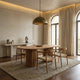 The solid wood dining set featuring a stylish and inviting furniture ensemble designed to accommodate eight people for dining comfortably. It combines the natural beauty of solid wood with the striking contrast of legs on the chairs, creating an eye-catching and contemporary look. Here's a description of the dining set: