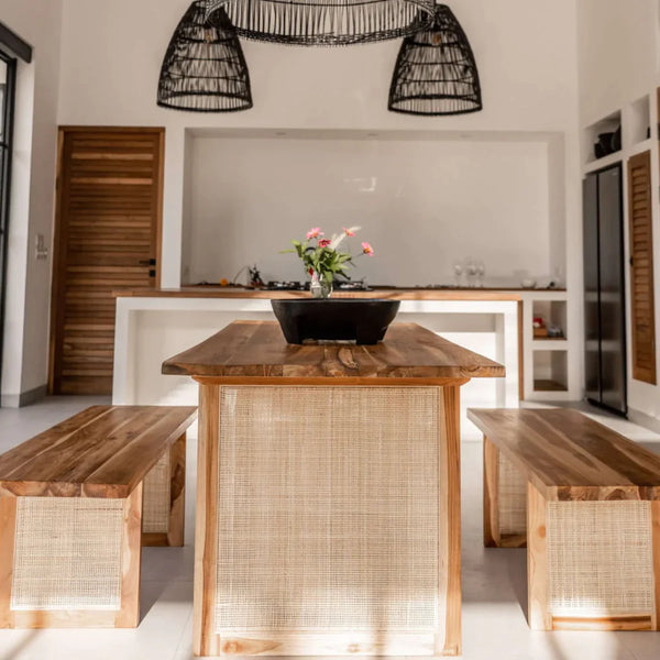 - The dining table is the centerpiece of the set and is crafted from solid wood, known for its durability and attractive grain patterns. Solid wood is a popular choice for furniture due to its strength and resistance to wear and tear. The tabletop is usually smooth and polished, providing a pleasant dining surface.