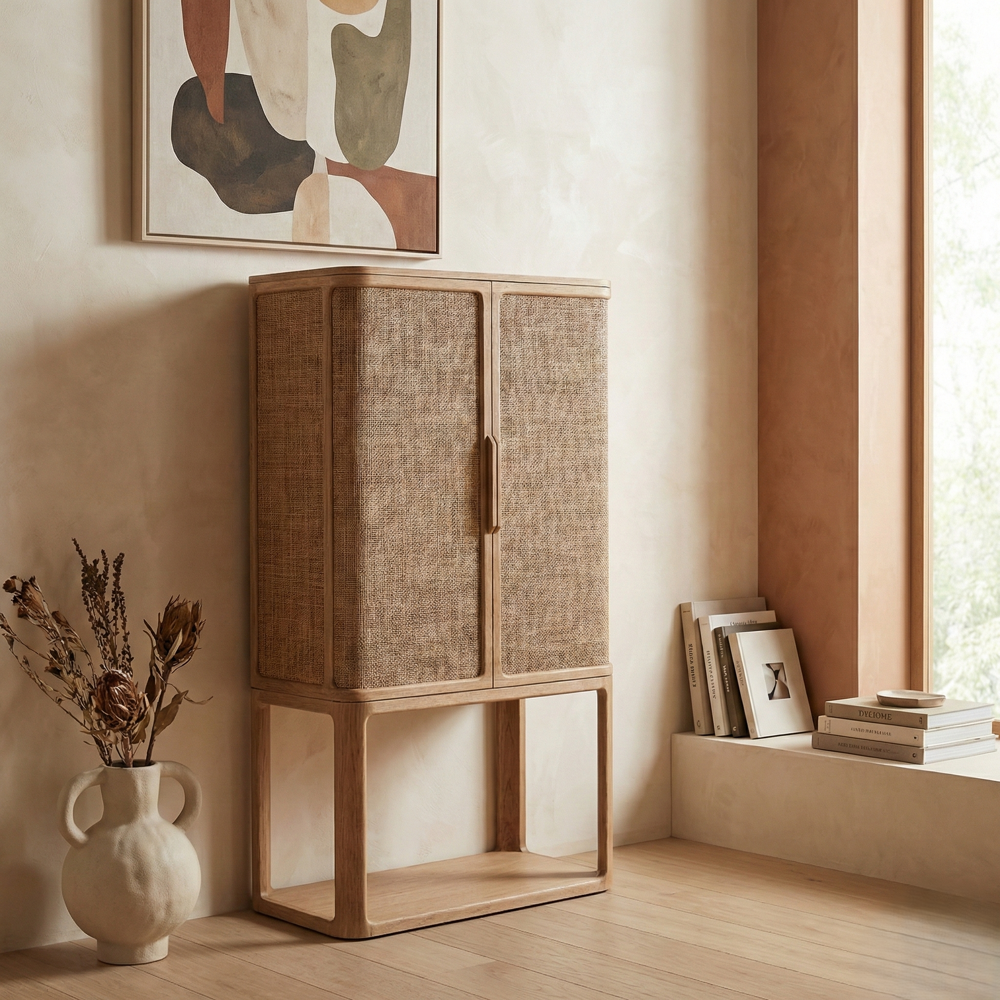 The bar cabinet features a rattan-fronted design, allowing you to showcase your glassware and bar accessories while keeping them protected from dust and dirt. The rattan doors provide a premium look for your house , adding an aesthetic appeal to your bar area.