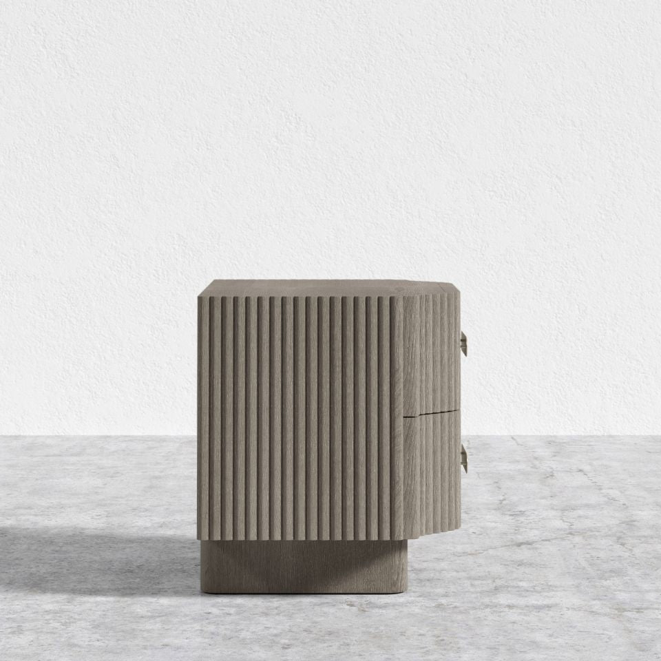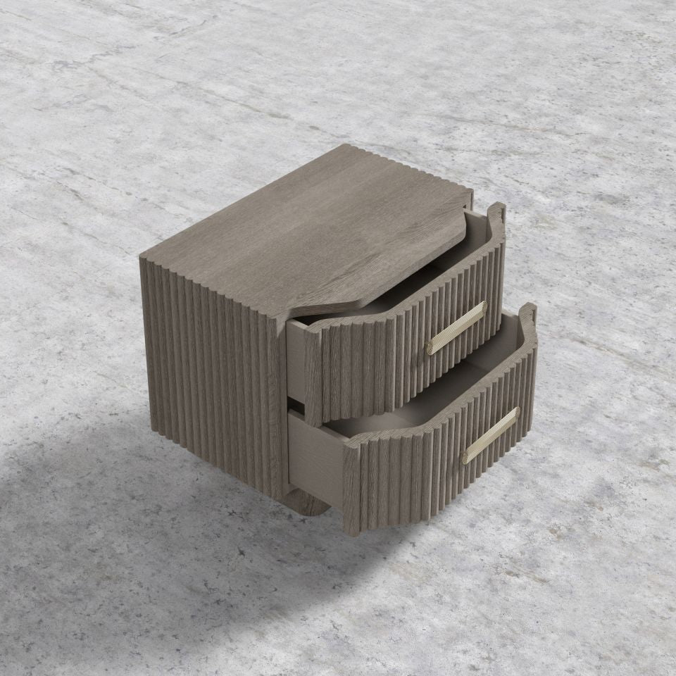 This elegant bedside table features a refined vertical fluted design that adds texture and depth to its modern silhouette. Crafted with a smooth, solid top and neatly integrated drawers, it offers both style and functional storage. The soft neutral finish brings warmth and sophistication, making it a perfect companion for contemporary, minimalist, or luxury bedroom interiors.
