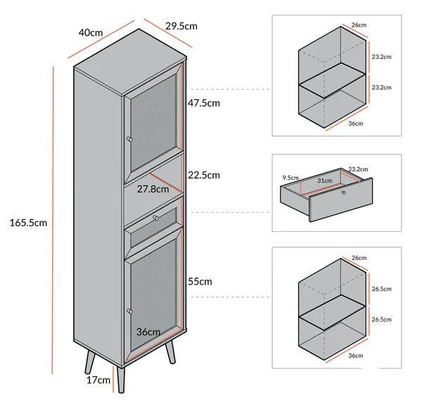 - With spacious shelving behind two rattan doors as well as having an open shelf and drawer, our Rattan Tallboy Unit is the perfect storage solution to have in the bathroom.