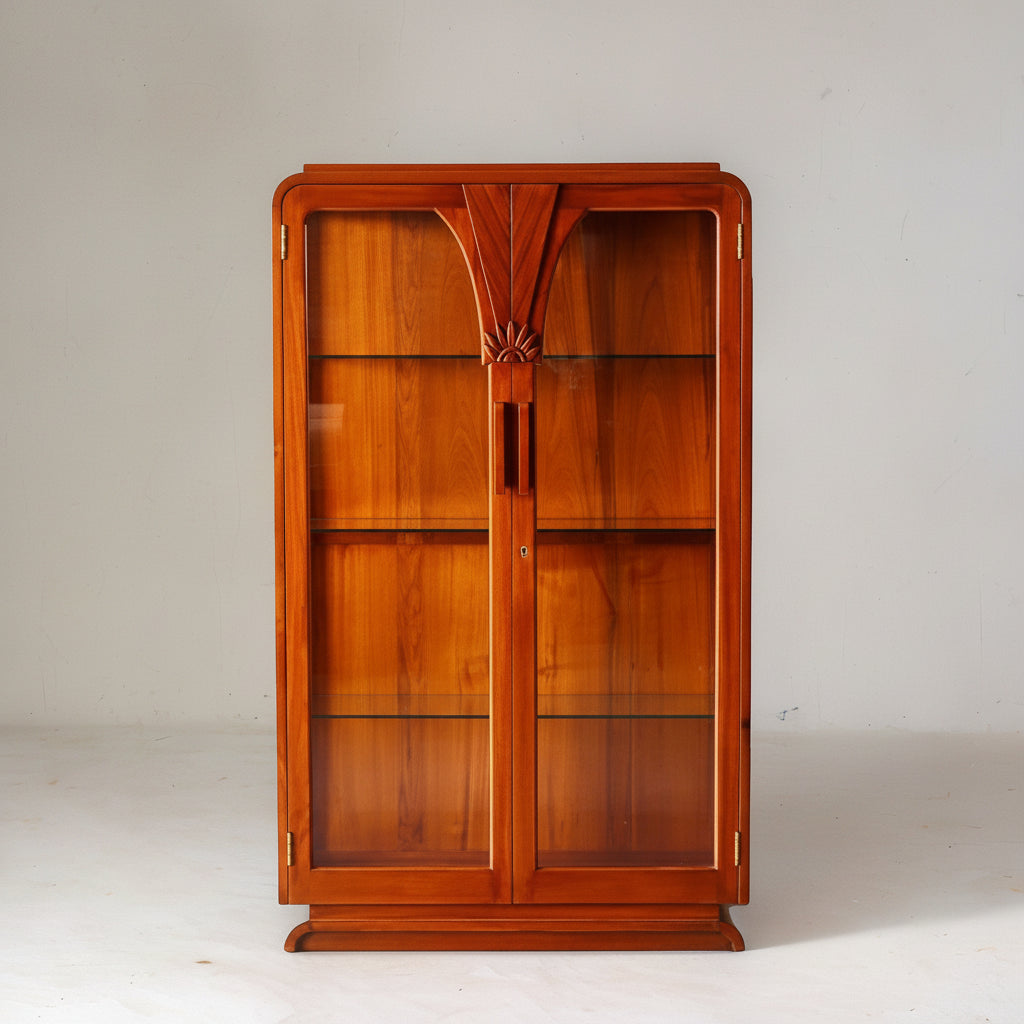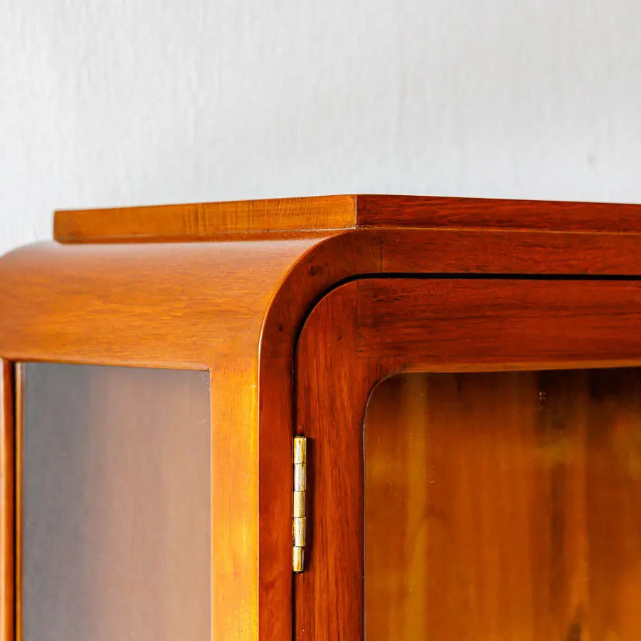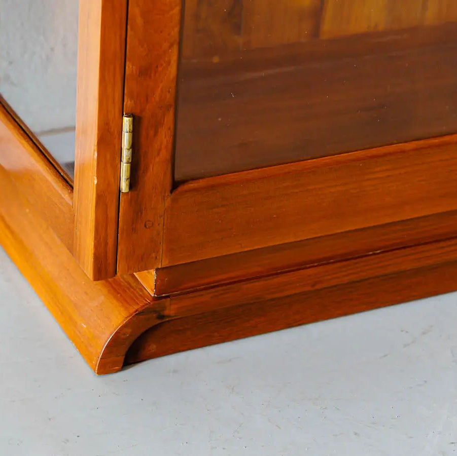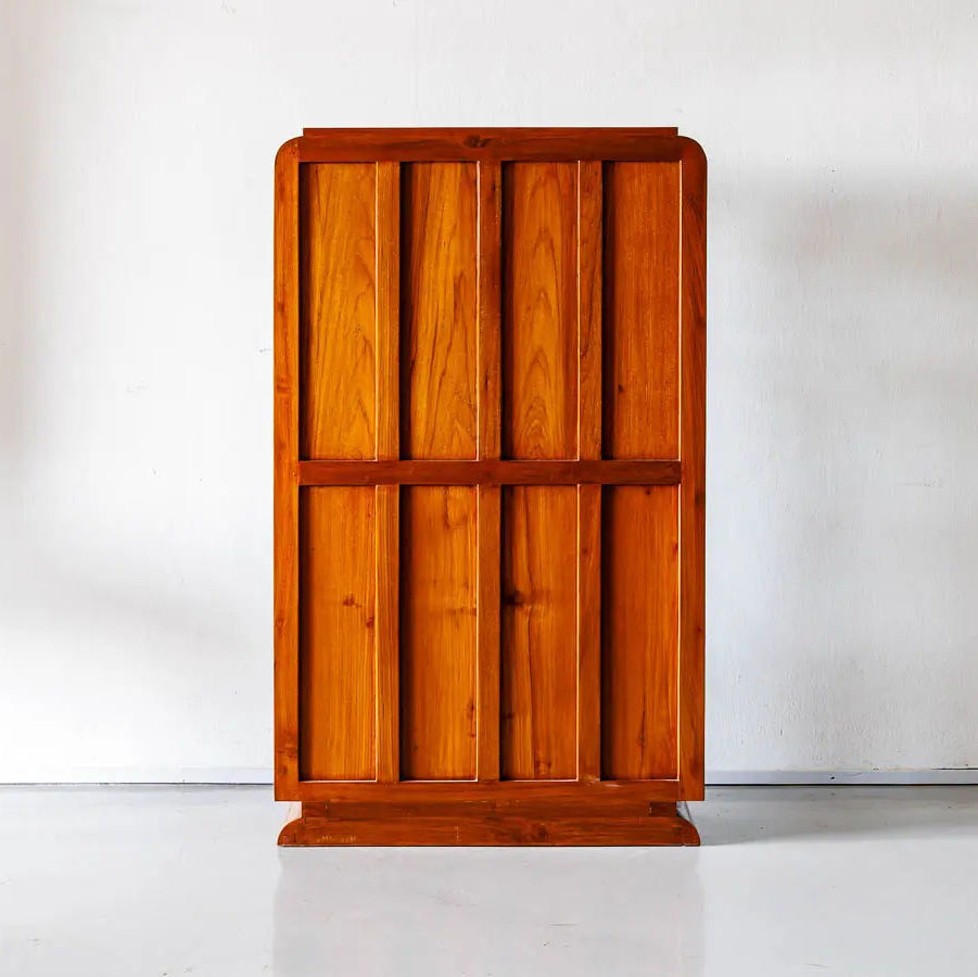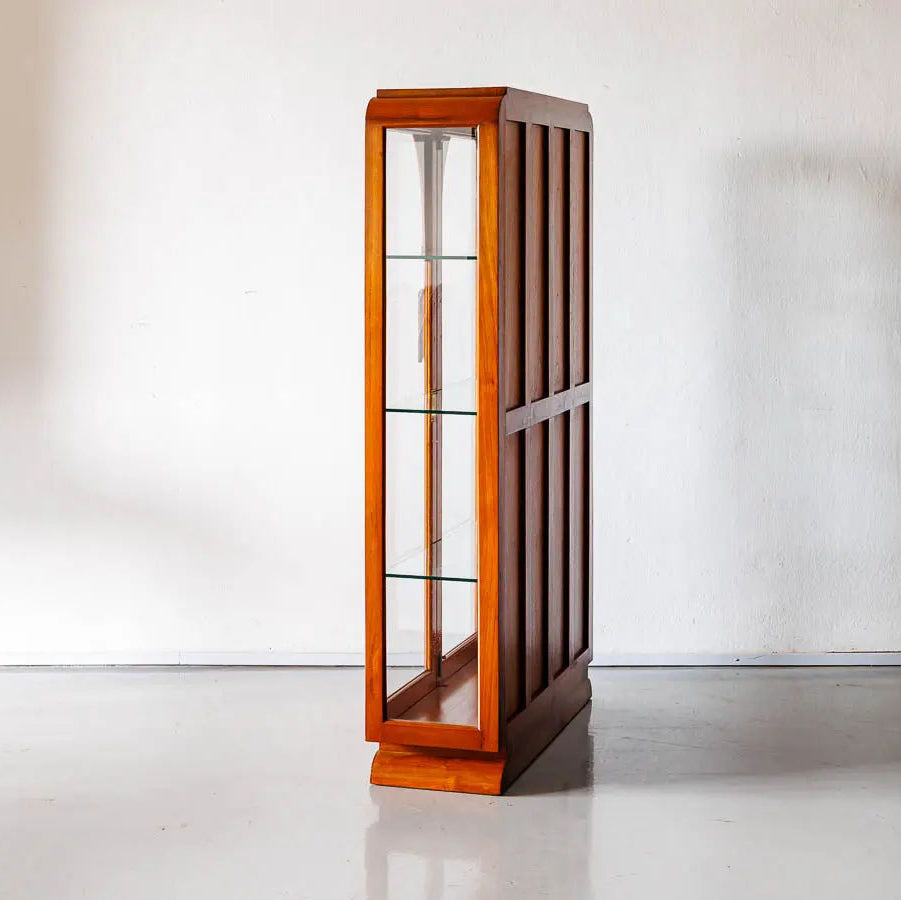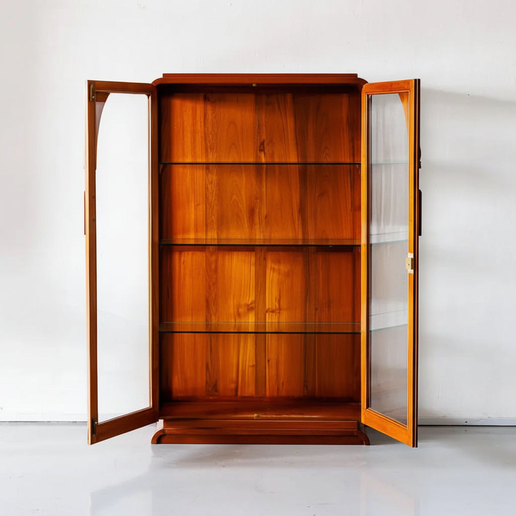 The design of the display cabinet is typically characterized by a long and slender structure with multiple shelves and compartments for organizing and displaying various items. The Teakwood's natural beauty and distinct grain patterns add to the cabinet's overall allure, making it an attractive focal point in the room.
