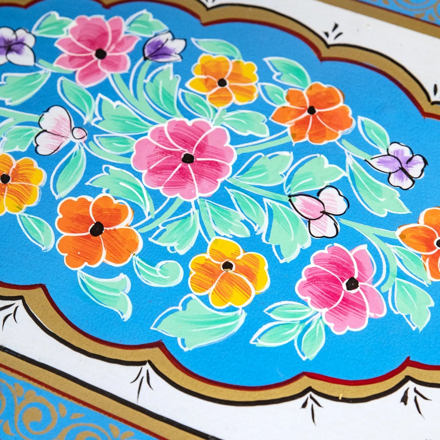 The floral motifs might include colorful blossoms, leaves, vines, or other nature-inspired elements, depending on the specific design. The choice of colors used in the painting can vary, but they are typically vibrant and eye-catching, creating a striking contrast against the natural hue of the mango wood.