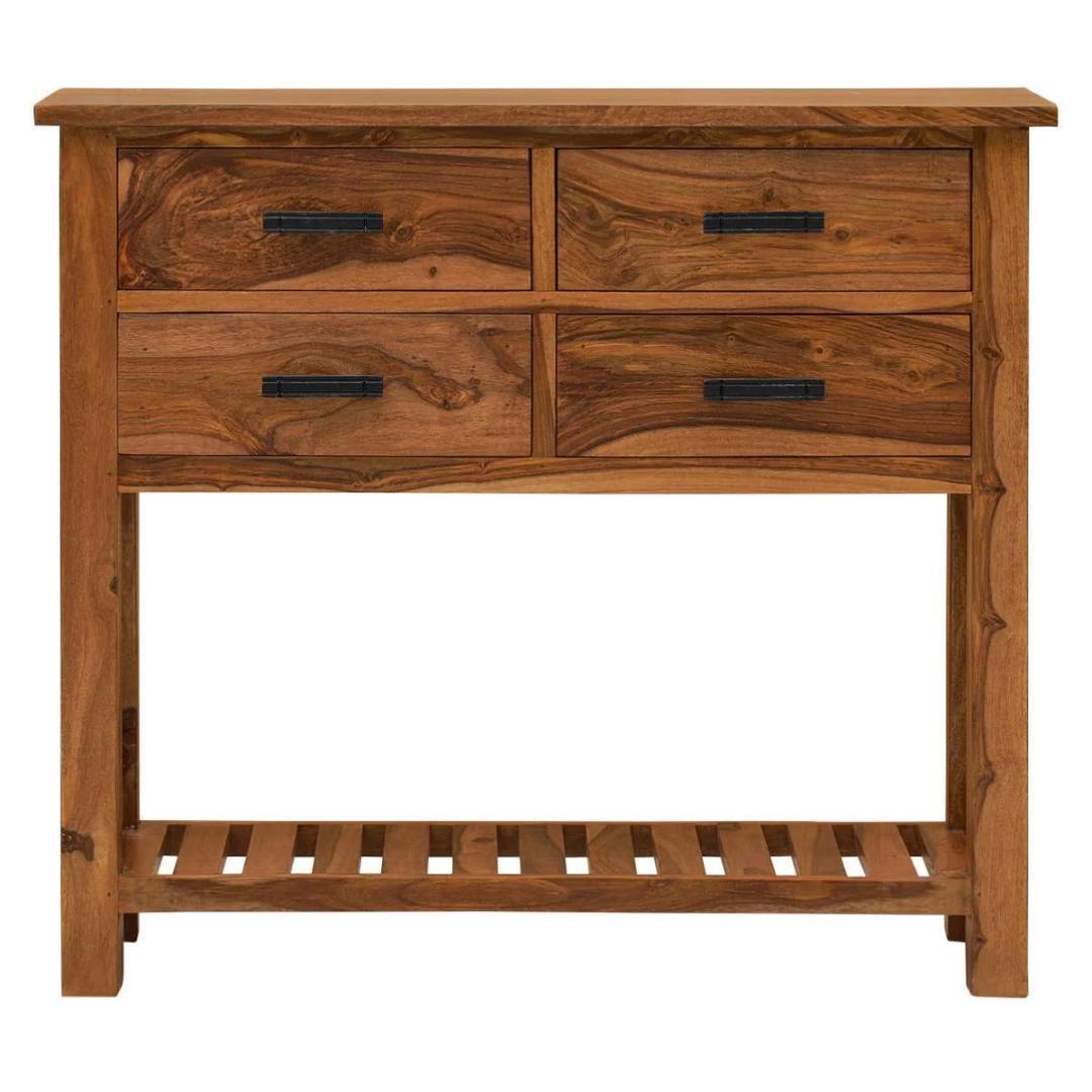 The Sheesham Wood 4 Drawers Open Shelf wooden console table is a piece of furniture designed to provide both storage and display options in a stylish manner. Here's a breakdown of its key features: