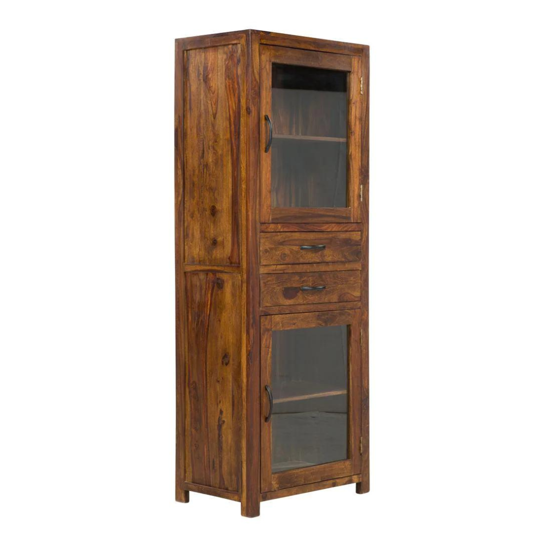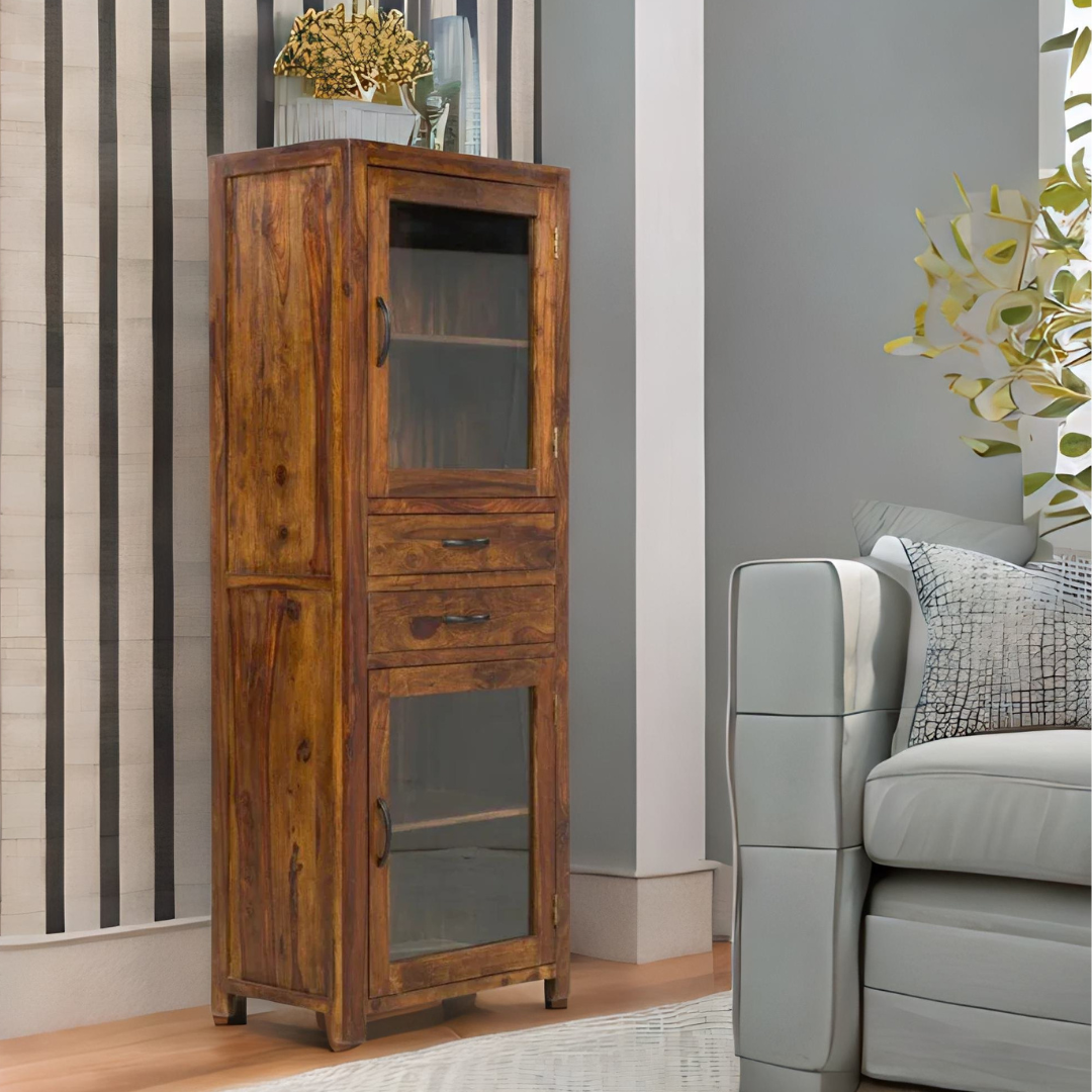 The design of the display cabinet is typically characterized by a long and slender structure with multiple shelves and compartments for organizing and displaying various items. The Sheesham wood's natural beauty and distinct grain patterns add to the cabinet's overall allure, making it an attractive focal point in the room.