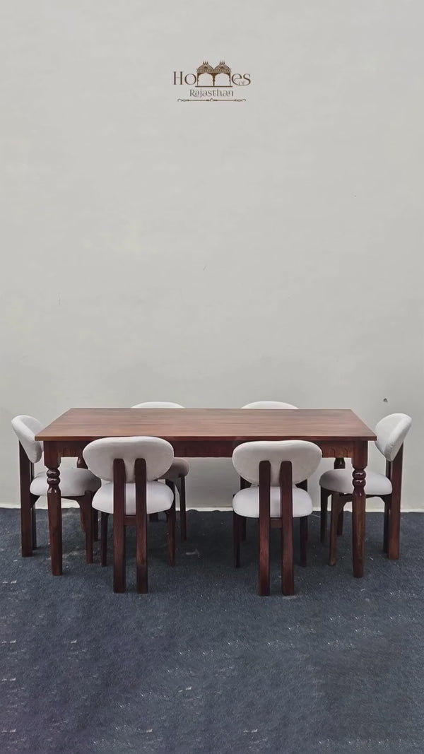 - The dining table is the centerpiece of the set and is crafted from solid wood, known for its durability and attractive grain patterns. Solid wood is a popular choice for furniture due to its strength and resistance to wear and tear. The tabletop is usually smooth and polished, providing a pleasant dining surface.