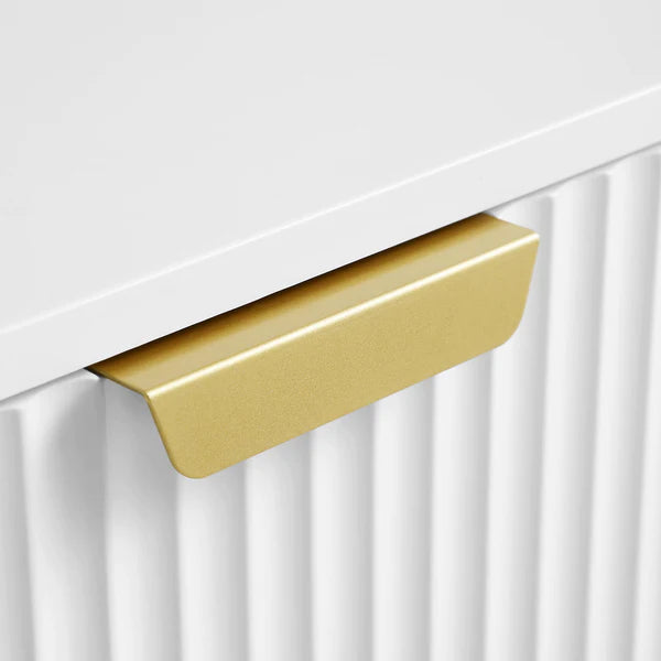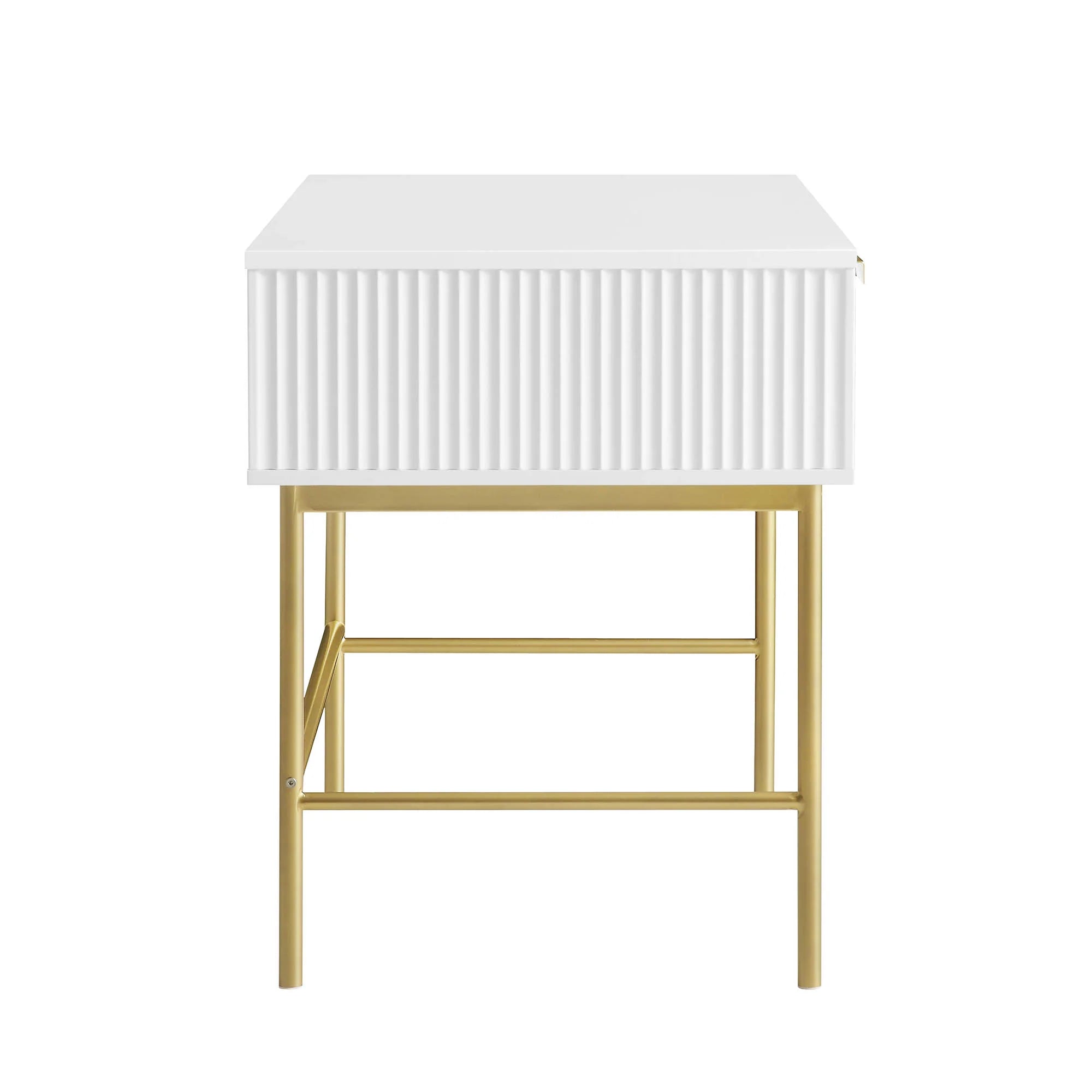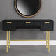 - The dressing table features 3 drawers with a front finished in matte paint, paired with gold handles and legs.
