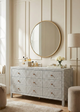 - Round mirror matches round solid wood handles and tapered legs.
