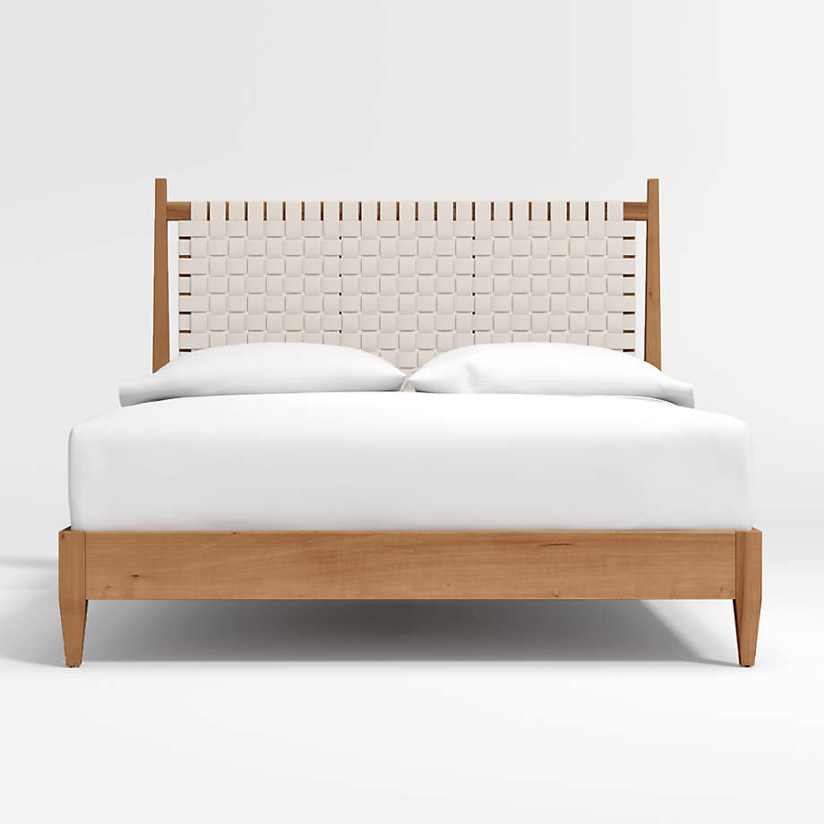 Niwar Solid Wood Bed With Handwoven Leather Headboard In White