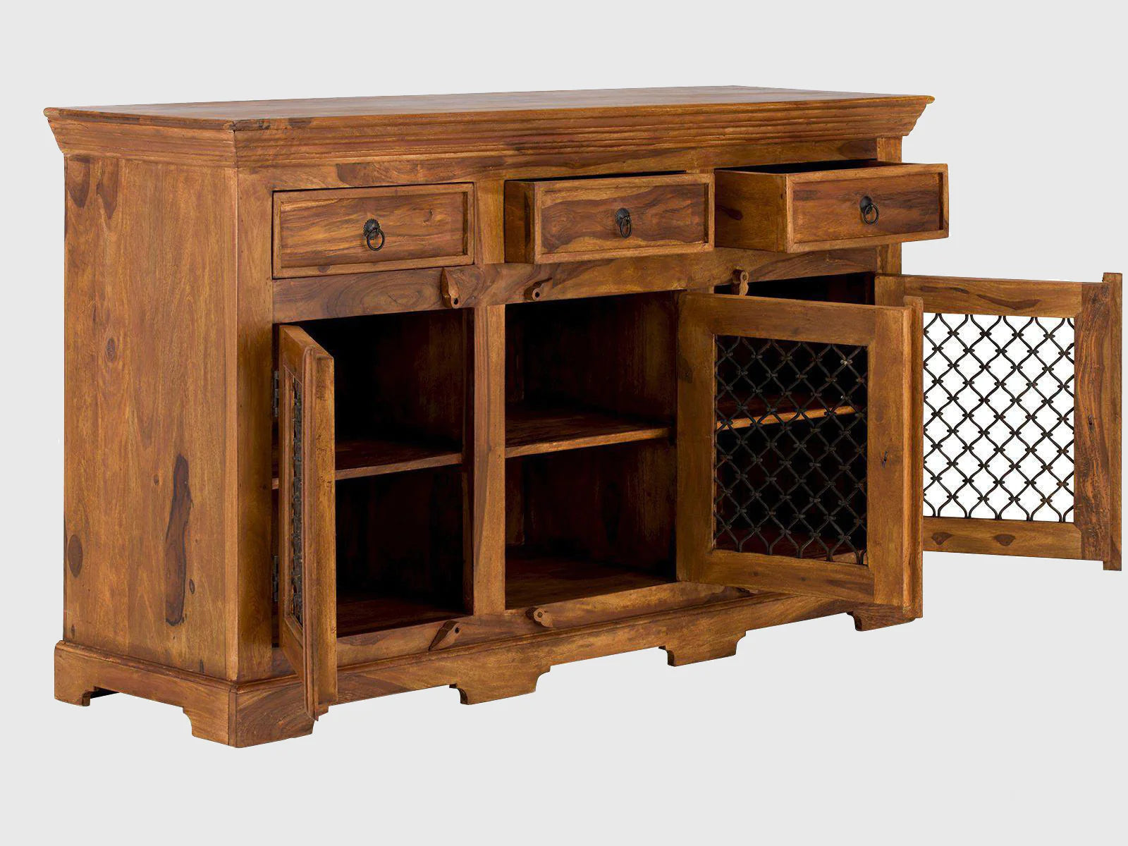 The sideboard cabinet's design showcases a sturdy wooden frame, crafted from high-quality wood such as Sheesham, mango, or acacia. The wood's natural grain patterns and finishes, such as honey, walnut, or distressed, add character and depth to the cabinet.