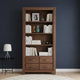 The honey finish on the walnut wood enhances its natural beauty and brings out the warm, golden tones of the wood. The finish also provides protection to the wood, making it resistant to scratches and ensuring the bookshelf maintains its elegant appearance over time. offering ample space for organizing and displaying books, photo frames, art pieces, and other decorative items. Some shelves may be open, while others might feature glass or wooden doors to add versatility and keep certain items protected or hidden.