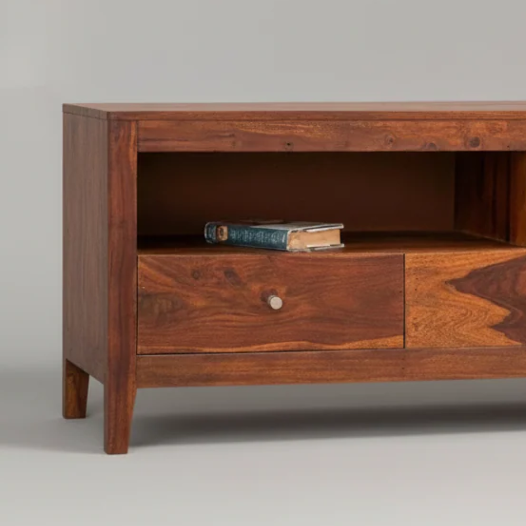 The sheesham wood tv cabinet features a sturdy construction made from high-quality Sheesham wood, known for its rich grain patterns and durability. The warm, earthy tones of the Sheesham wood lend an inviting and organic feel to the piece.