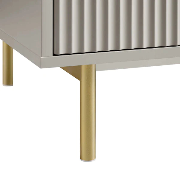 - The wardrobe features stylish ridged doors and drawer front finished in matte paint, paired with gold handles and legs.