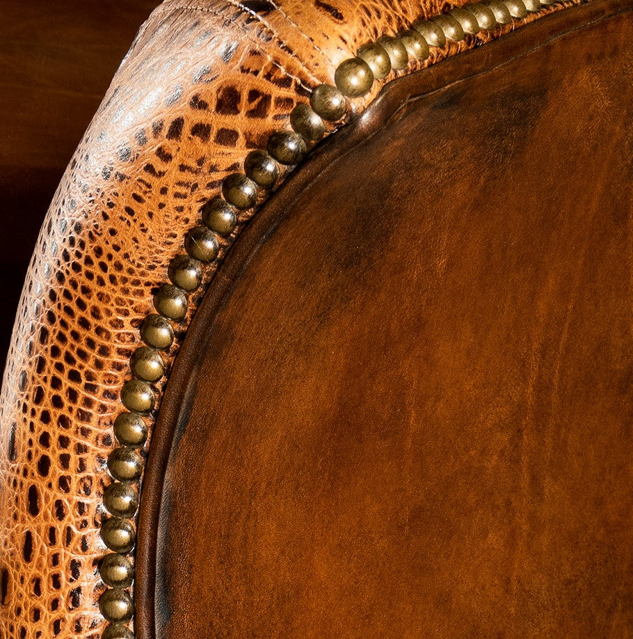 Leather Description: Artisan Leathers beautifully evoke this time worn quality, unique to every individual piece, like the originals. To pure aniline leather crusts, already fully and carefully upholstered to the piece, a base color is created with multiple applications of waxes and oils, hand-worked by the leather Artisan. After drying, this craftsman then carefully builds-up the finish with an expert’s eye, and touch, to achieve an aged patina in just the right places to reflect the aged qualities only time, wear, and frequent care could have accomplished naturally.