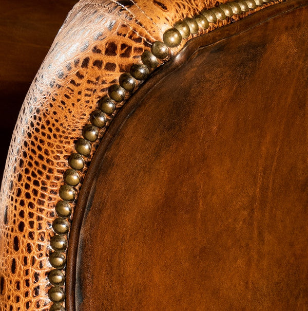 Embossed Leather Description: A leather used to accent many of today's home interiors. The leather hide is first embossed with a large crocodile grain and then colored by applying two base color coats of micro pigments. The leather is then wiped-off to give it a contrast of colors utilizing the base color combination. This color contrast is further accented by two additional top coat colors that are wiped-on by hand to give the leather a beautiful antique look. The last step is to slightly protect the hand work of the leather hide with a lacquer topcoat that provides great depth and warmth to the finished product.