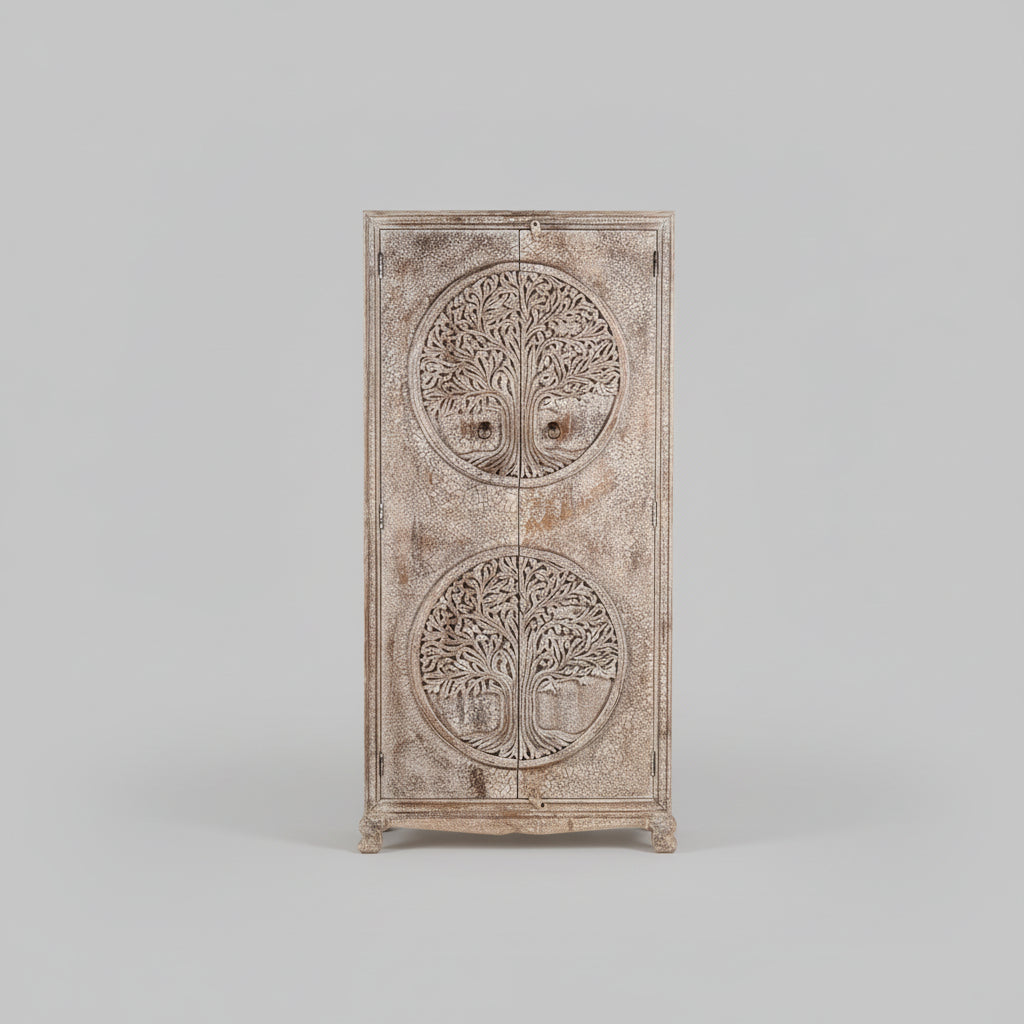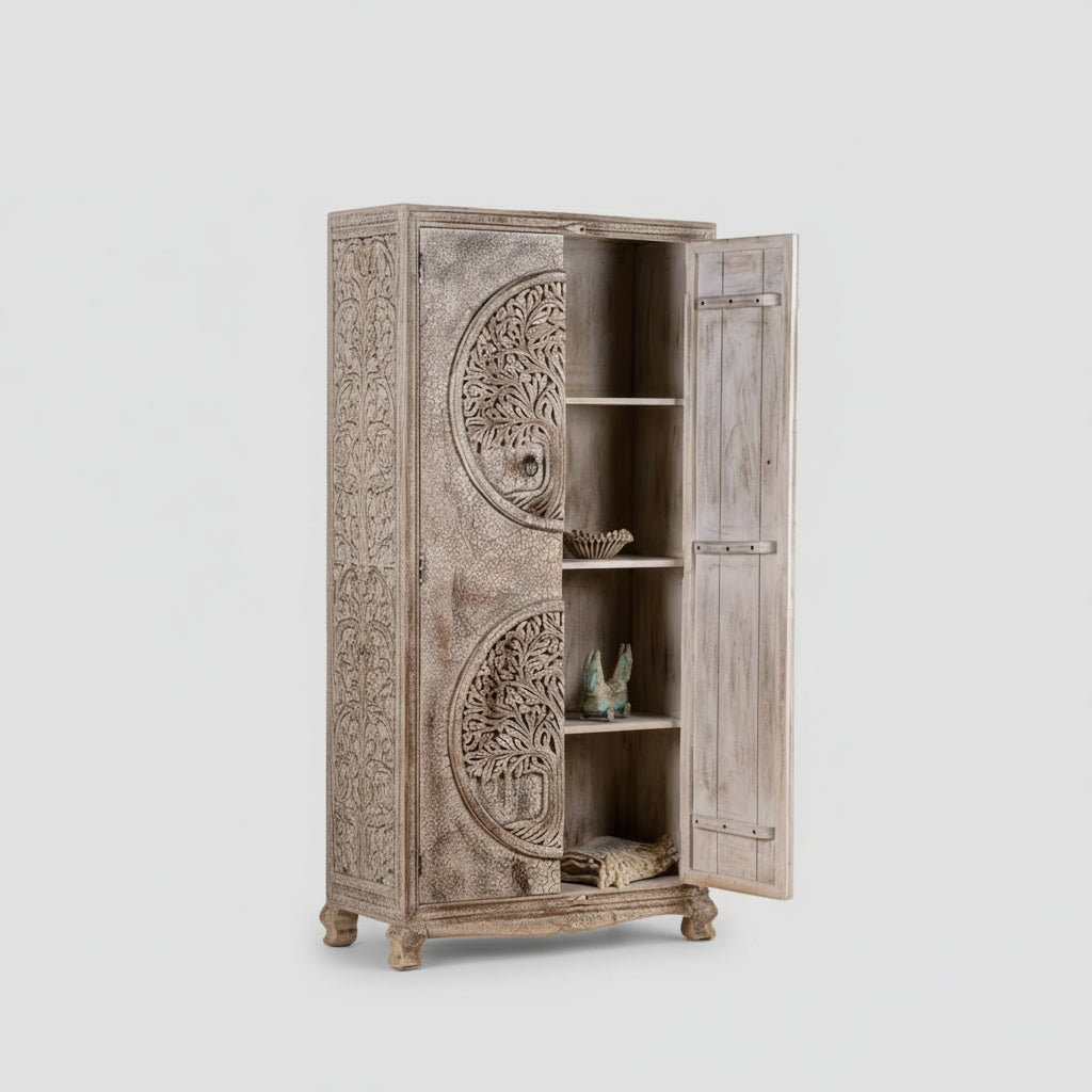 The design of the cabinet is typically characterized by a long and slender structure with multiple shelves and compartments for organizing various items. The Bohemian style add to the cabinet's overall allure, making it an attractive focal point in the room.