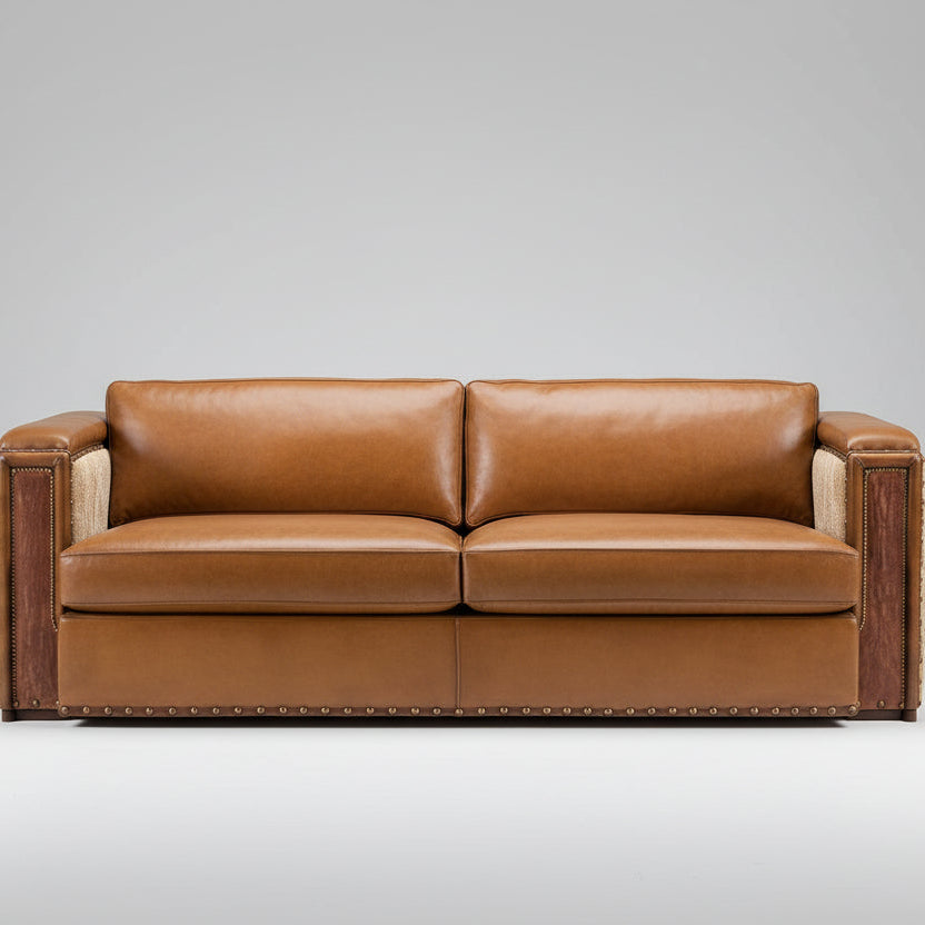 Our Barca Architect Sofa is modern rustic style with timeless comfort and quality. Featuring a hand burnished leather to achieve an aged patina in just the right places to reflect the aged qualities only time, wear, and frequent care could have accomplished naturally. The large boxy arms and studded genuine brass nail heads add that rustic feel while maintaining a modern design.