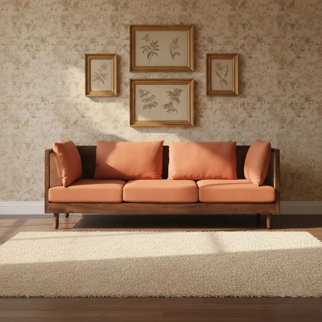 The 3 seater sofa in brown and orange is a stylish and comfortable seating option for your living space. It features a sturdy frame constructed from high-quality solid wood, providing durability and stability.