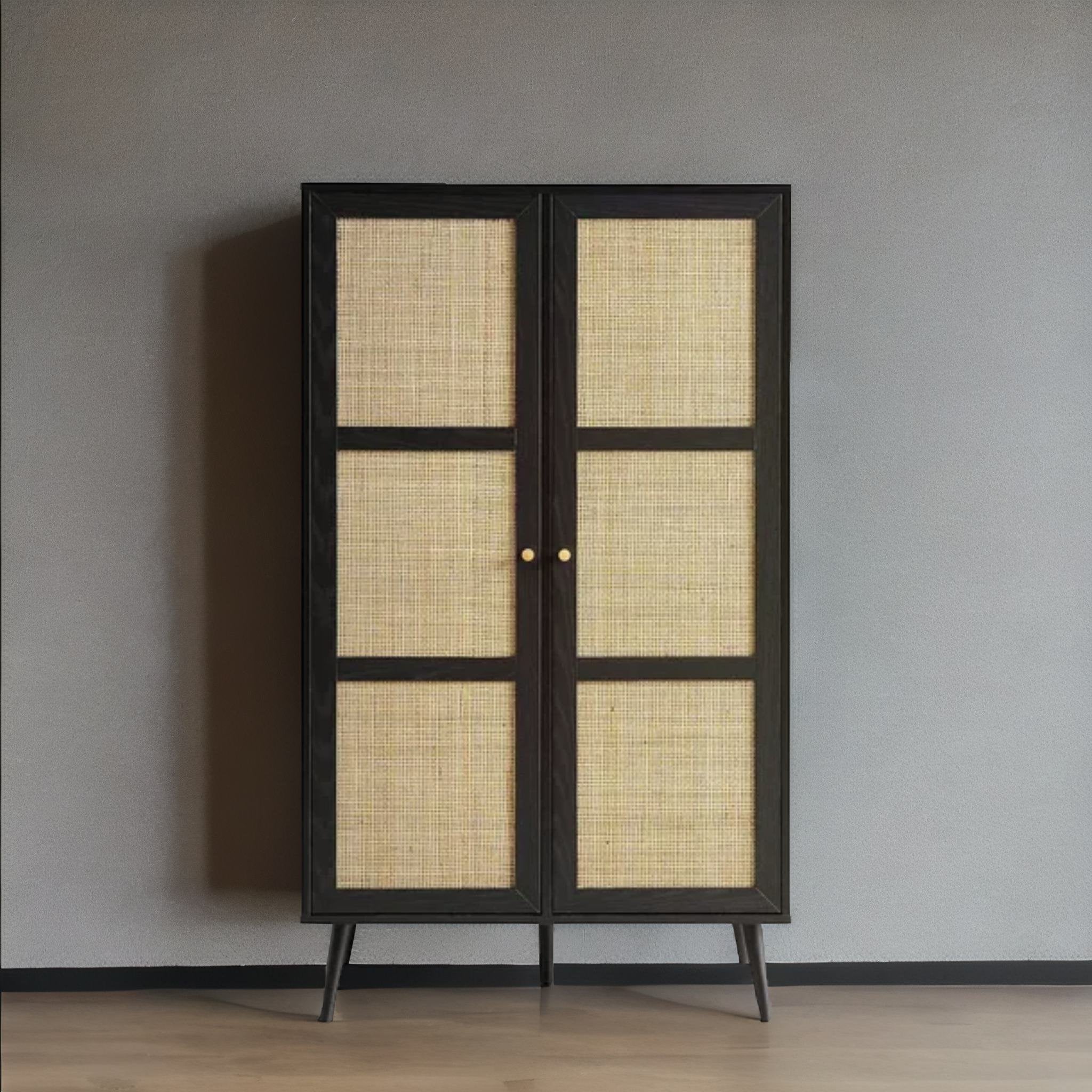 - Design: The wardrobe typically features a simple yet elegant design. It has two doors that open outward to reveal the storage space inside. Crafted from wood and natural rattan, our Woven Rattan Small Wardrobe adds a bohemian vibe to your room and will give you the perfect solution for any extra storage space you may need.
