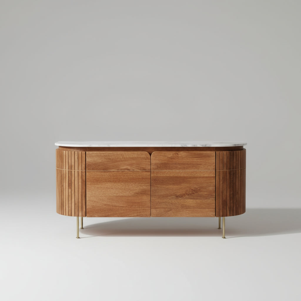 The wooden sideboard is a luxurious and contemporary piece of furniture that combines the natural beauty of solid wood with the elegance of a marble surface. This sideboard is designed to be a statement piece in your living room, dining room, or any other area where you need additional storage and surface space.