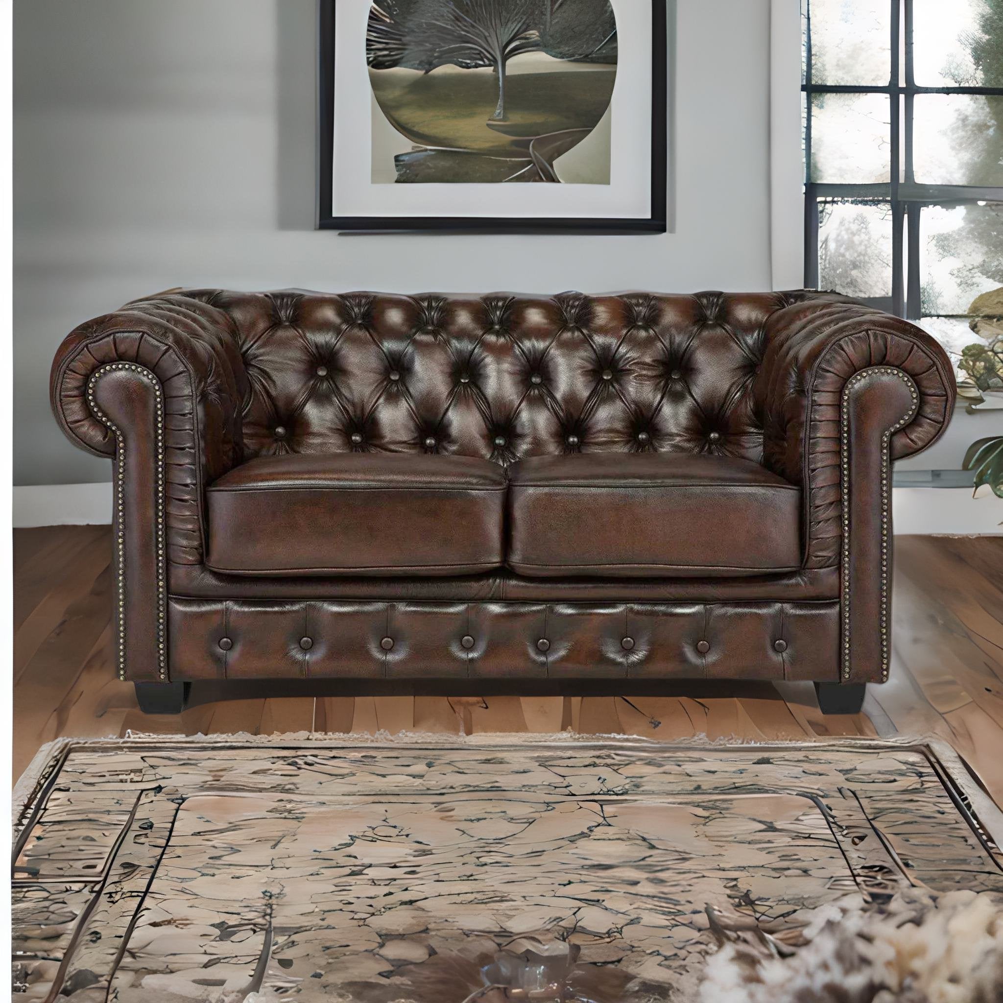 Elegant hand burnished leather accented with brass nail heads makes the Sofia Tufted 2 seater sofa a fine addition to any home. This classy piece of furniture boasts a subtle curving shape that allows it to blend seamlessly into any room. The sofa features commanding, solid shapes and lines, complimented by a deep tufted inside seat back. The Sofia Tufted Leather Sofa is one of the most stunning examples of an elegant sofa design.