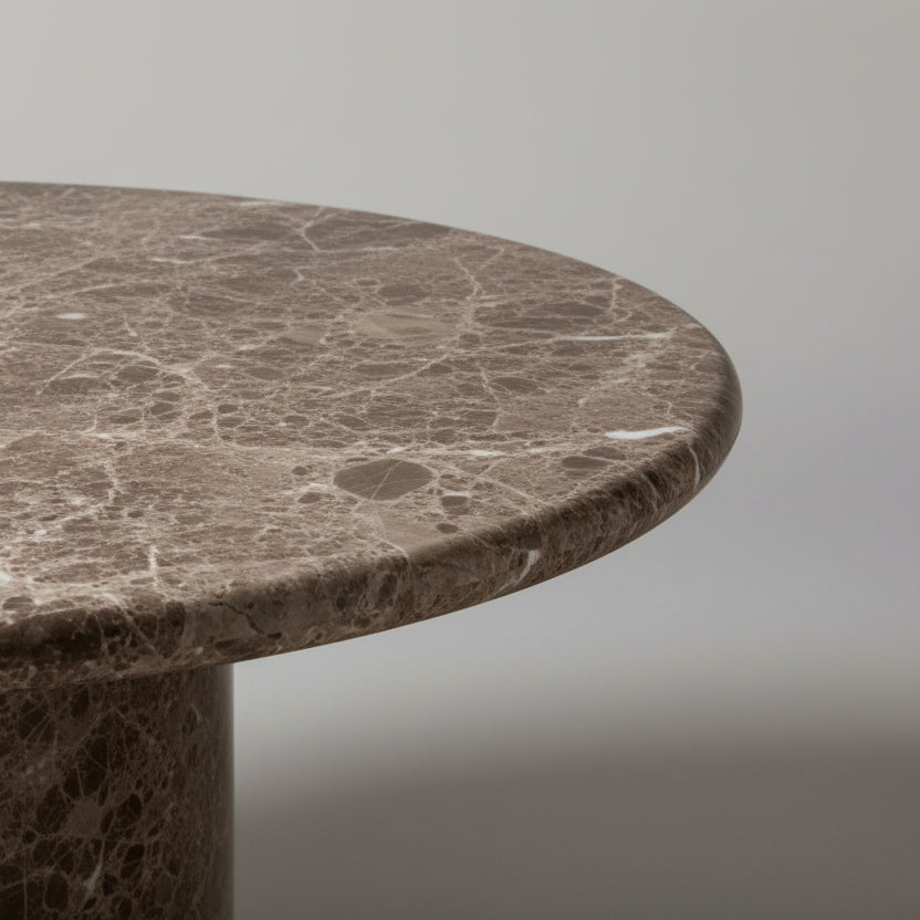 This beautifully crafted marble table features a solid cylindrical base with a smooth, rounded tabletop, showcasing natural stone textures and earthy grey tones. The polished surface highlights the marble’s organic veining, giving each piece a unique character. With its sturdy structure and timeless design, this table blends effortlessly into modern, minimal, or classic interiors—ideal as a side table, accent table, or decorative stand.